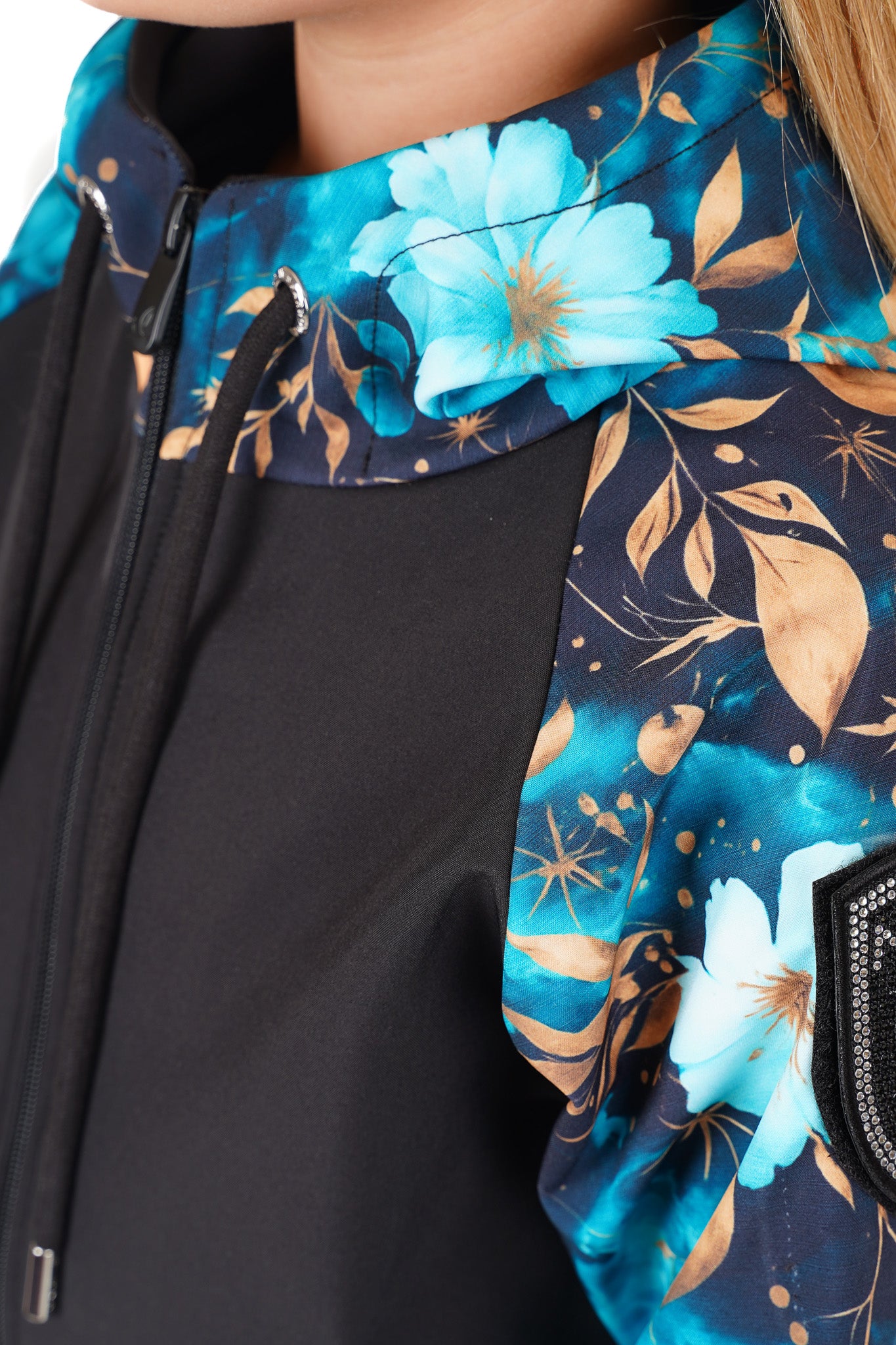 Tato jedinečná bunda kombinuje krásný tyrkysový květinový motiv s výraznými květy na tmavém pozadí.